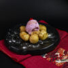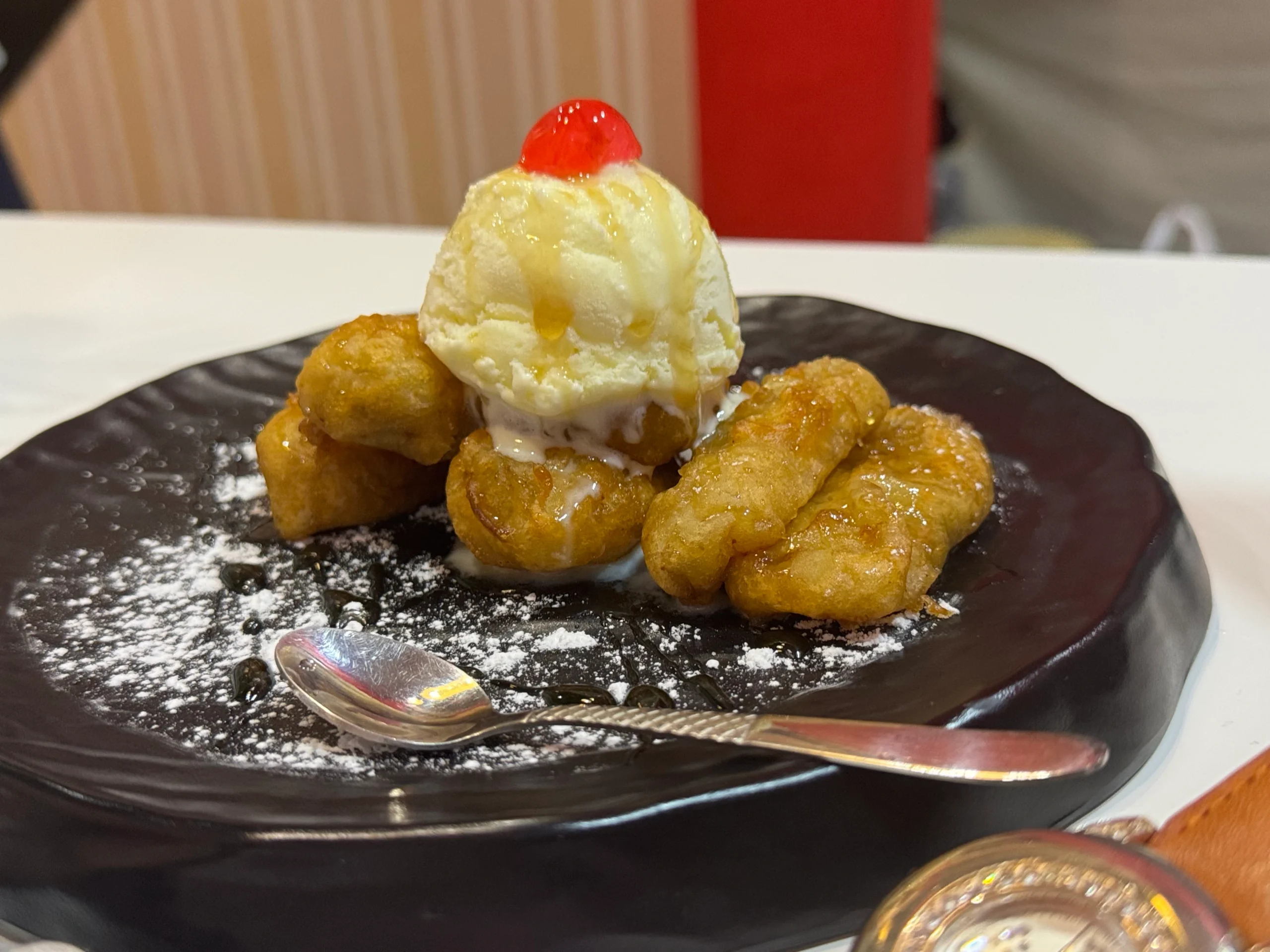 Banana Fetter – Ripe banana slices fried in a sweet batter, topped with honey dressing and served with vanilla ice cream