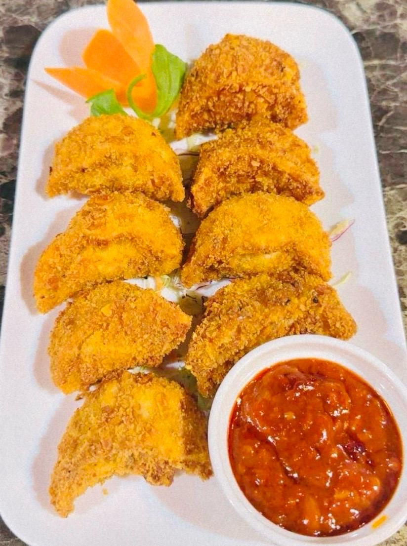 Juicy spiced minced chicken seasoned with onion, garlic, ginger, coriander, and a blend of secret spices, wrapped in a delicate dumpling sheet, coated with crispy crumbs, and deep-fried to perfection. A crunchy twist on your favorite momo