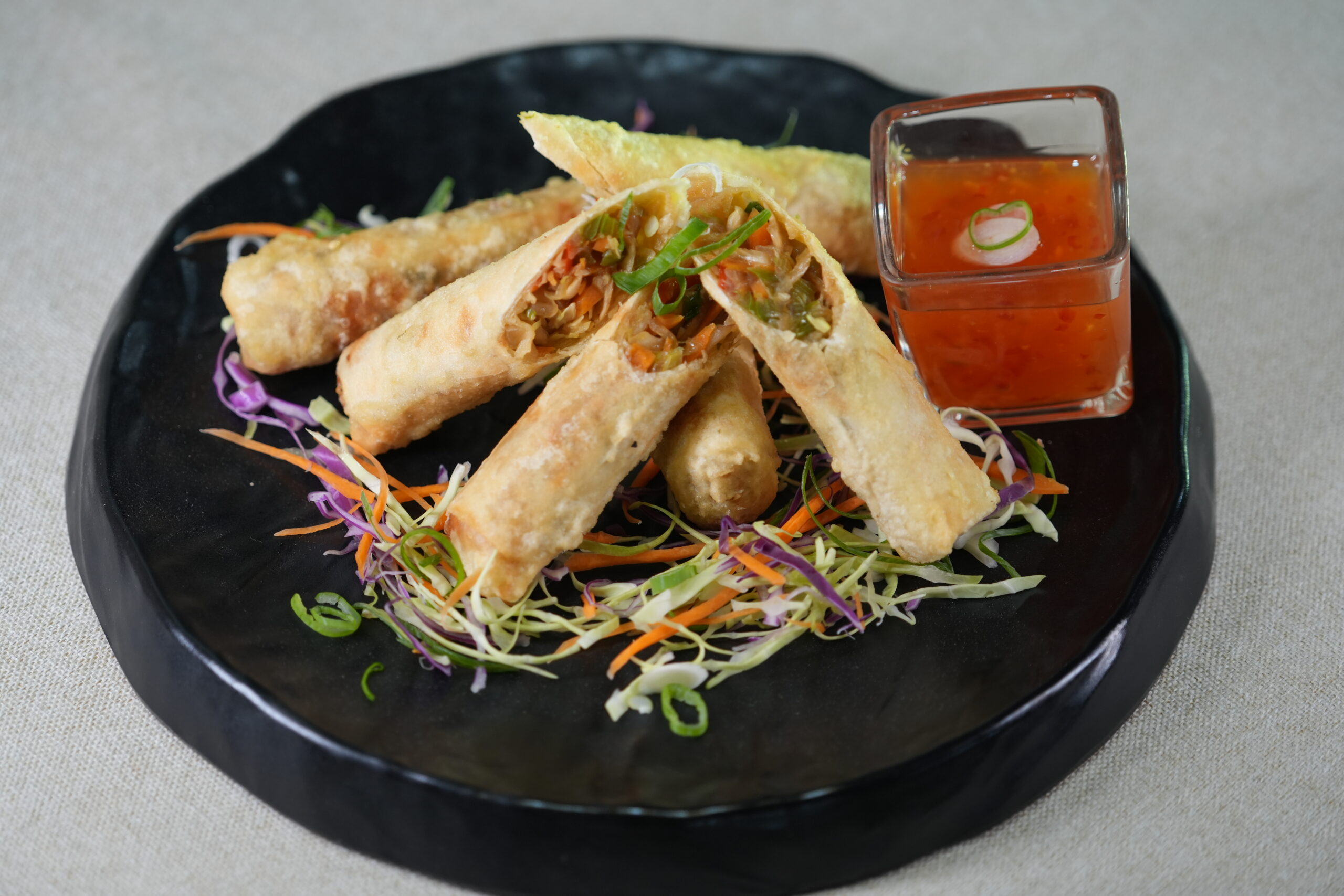 Crispy golden rolls filled with a savory mix of vegetables including onion, cabbage, carrot, and bell pepper, wrapped in a thin roll sheet