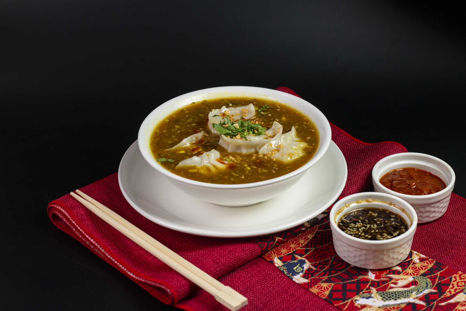 Juicy chicken momos are served in a flavorful, spiced soup like gravy jhol. Its warm, tangy, and full of aromatic spices perfect comfort food.